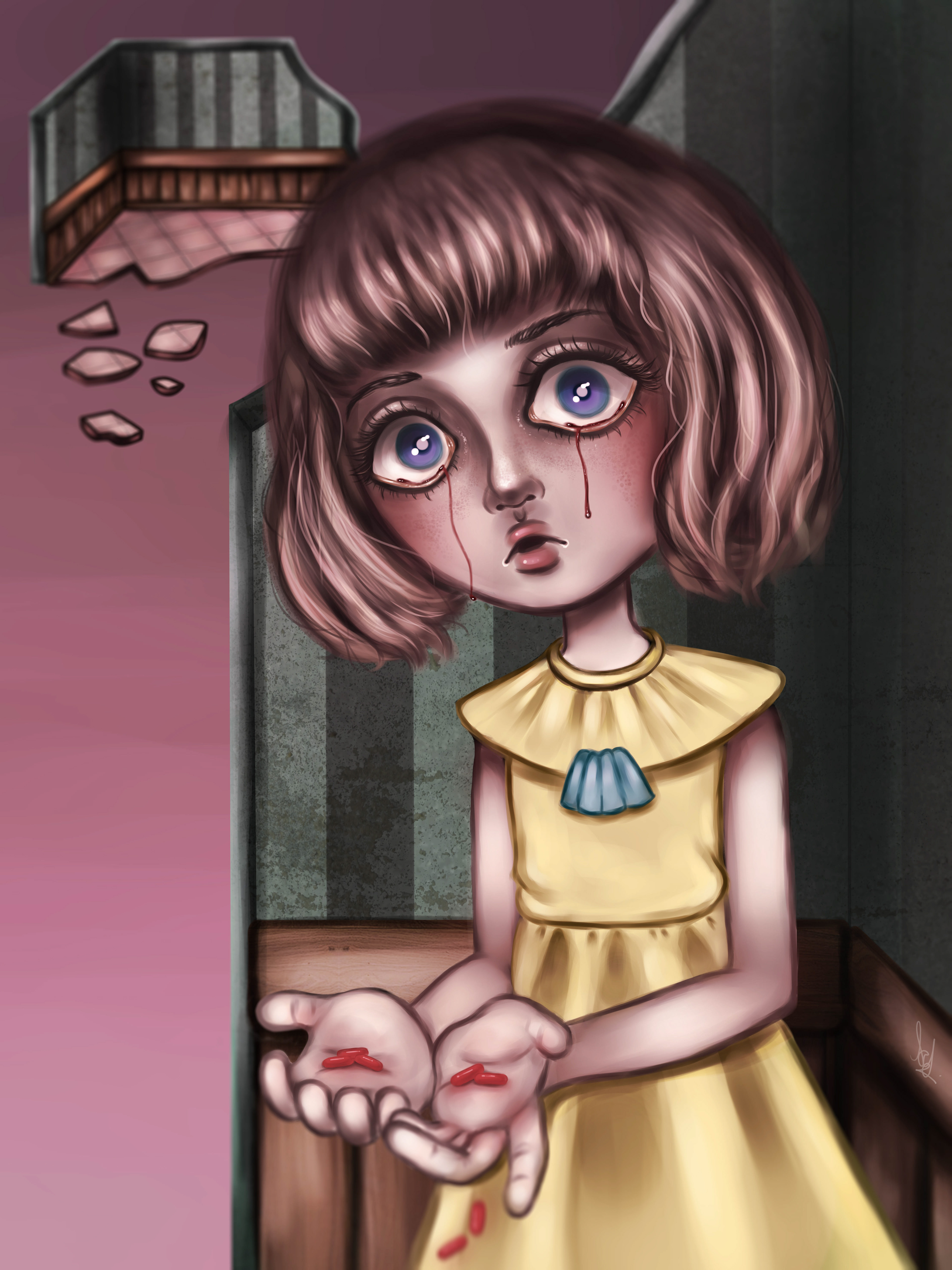 "As Innocence bleeds, and worlds shatter, Look into one's own mind, And try to find the pieces of a jigsaw puzzle". A fanart of Fran from one of my favorite games "Fran Bow" .